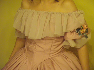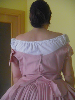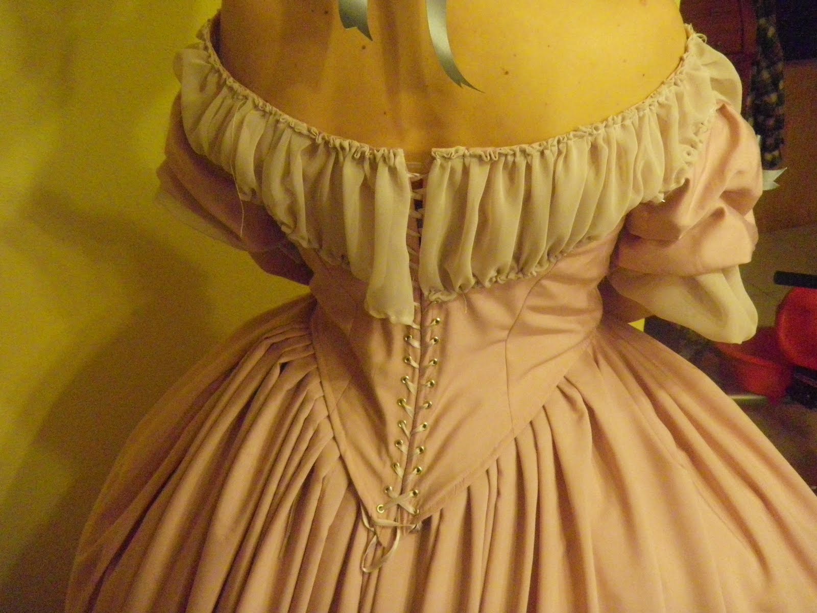 En la parte trasera lo que más me preocupaba era como cerrar la berta poniendo los ojetes. Al final, creo que acerté con la opción que tomé, ya que la gasa va por encima del cierre.Y con esa dichosa arruga no sé que voy a hacer. Espero que cuando vuelva a planchar las ballenas se queden de mejor forma.
