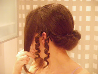 Ahora pasamos a la parte delantera. De un lateral se divide en tres mechones. El más cercano a la cara se dejará liso y se aparta. Con los otros dos de forman sendos tirabuzones con un rizador. Si pretendéis que os dure echarle mucha laca,y antes poner espuma (a mí aún así se me quitó enseguida =( )