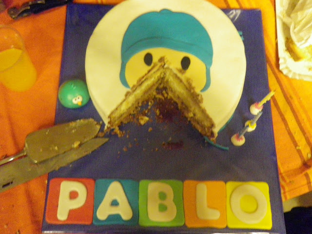 Después de merendar llegó el gran momento: la tarta! Era el momento que más esperaba, ya que este año se la he encargado a una compañera mía al recién descubrir a lo que dedica sus ratos libres (entre el trabajo, la casa y dos niños pequeños ;0 ) Era una tarta fabulosa de Pocoyo y además acompañado de Pajaroto =)