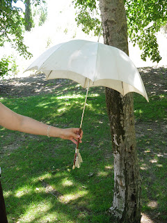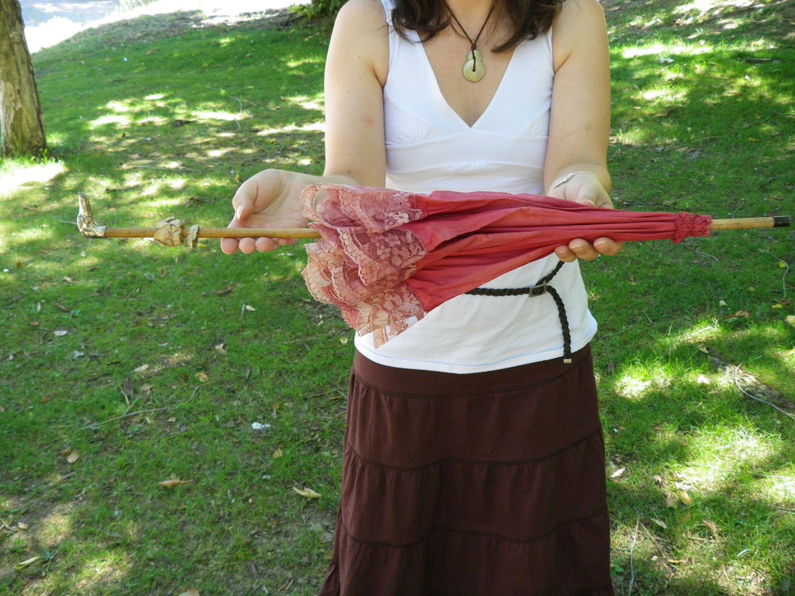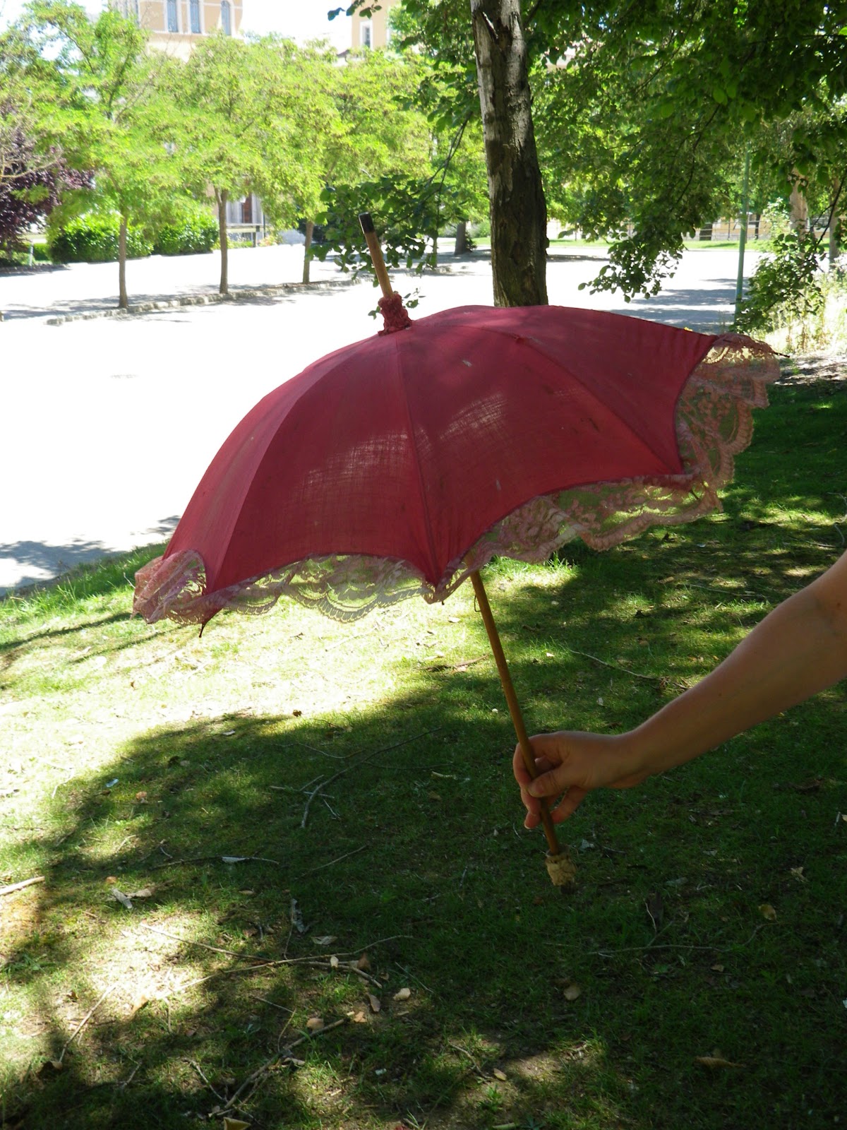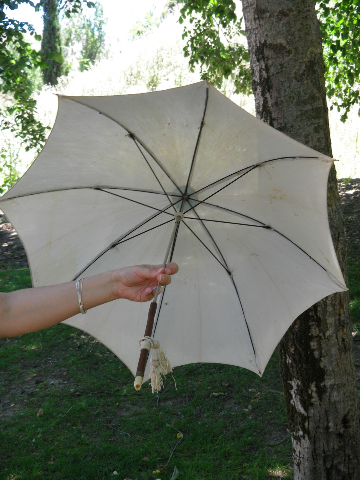 Fue todo un hallazgo y un pequeño tesoro que poseo. Siempre me han apasionado las sombrillas antiguas, pero las de verdad, no los paraguas que hacen ahora queriendo imitar sombrillas, pues soy un poco tiquismiquis con la forma de las varillas y la tela que usan. Y a pesar de la modernas ténicas de elaboración de hoy día, no consiguen hacerlas con la forma de antes, y eso me lleva a desilusionarme cuando intentaba comprar alguna. Ahora ya tengo mi pequeña colección y además son auténticas :)