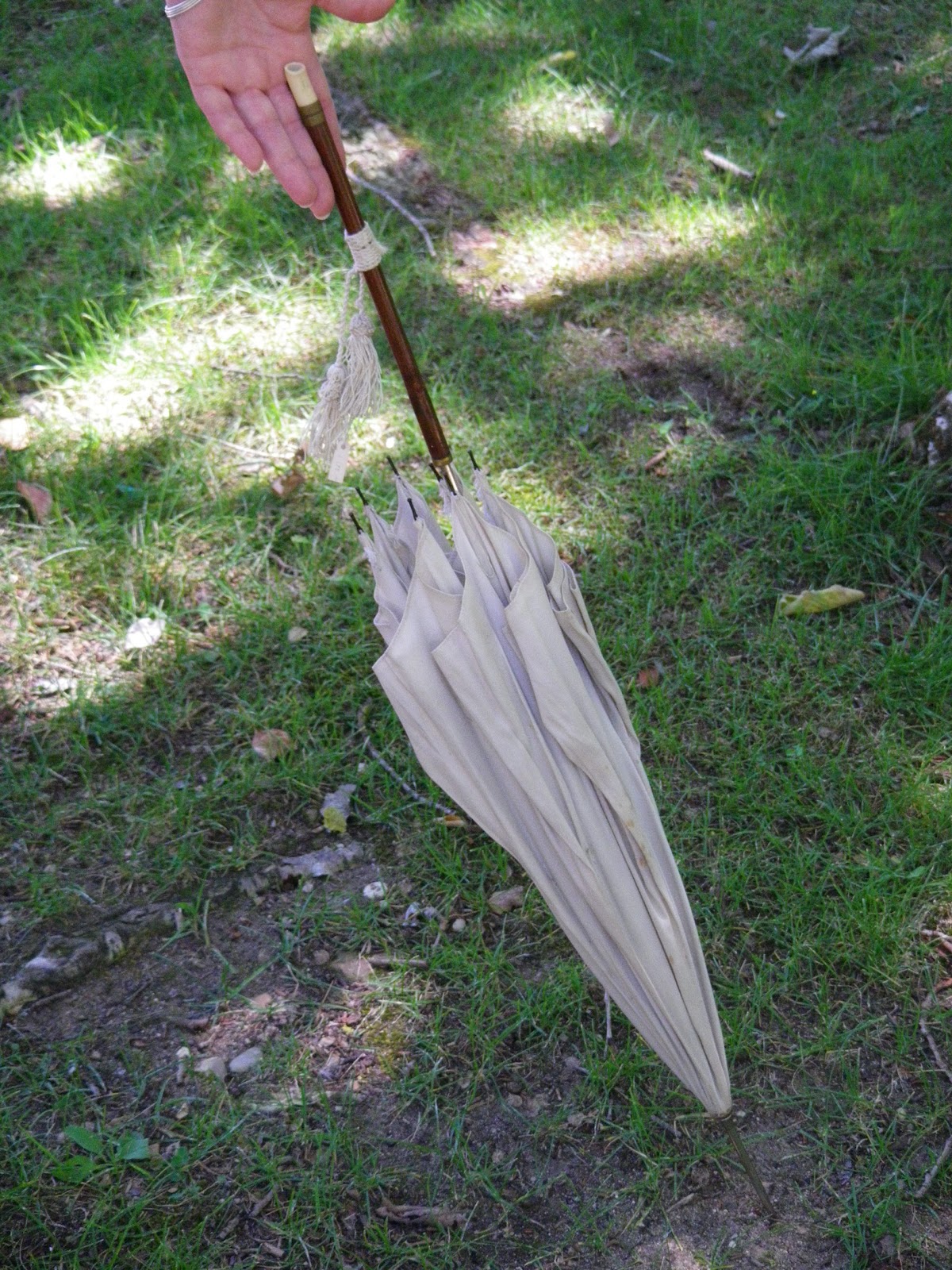 Cuando aún estaba temblando al conseguir mi primera sombrilla, el vendedor me ofrecía otra. No se muy bien a la época que pertenece, pero quizás entre 1855 y 1885. El color me recordó enseguida a las "fashion plates" de los vestidos de día de 1855, que combinan los tonos oscuros y los claros creando una composición más alegre. Tuve la oportunidad de lucirla en nuestro viaje a través del tiempo en Miranda de Ebro. Lástima que ese día lloviera y no quería abrirla para que no se dañara más el tejido con la humedad, pero la disfruté muchísimo.