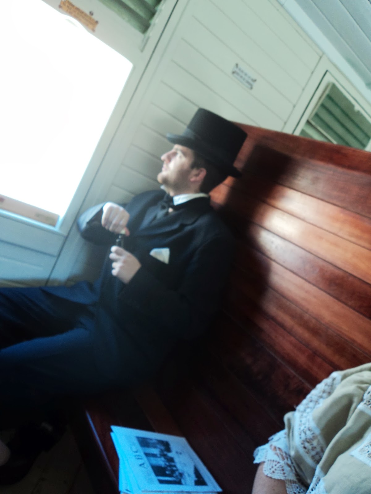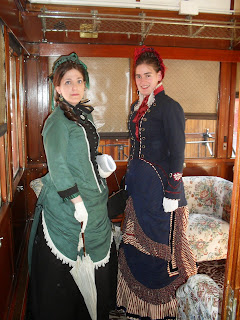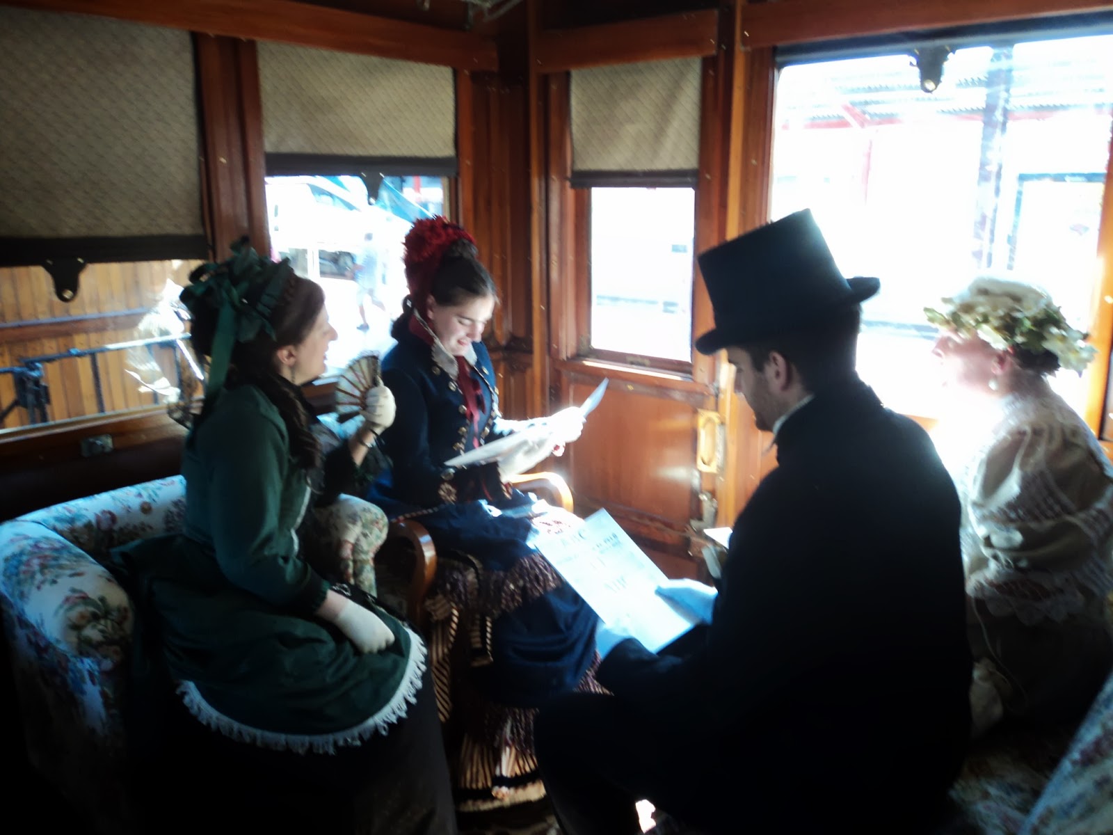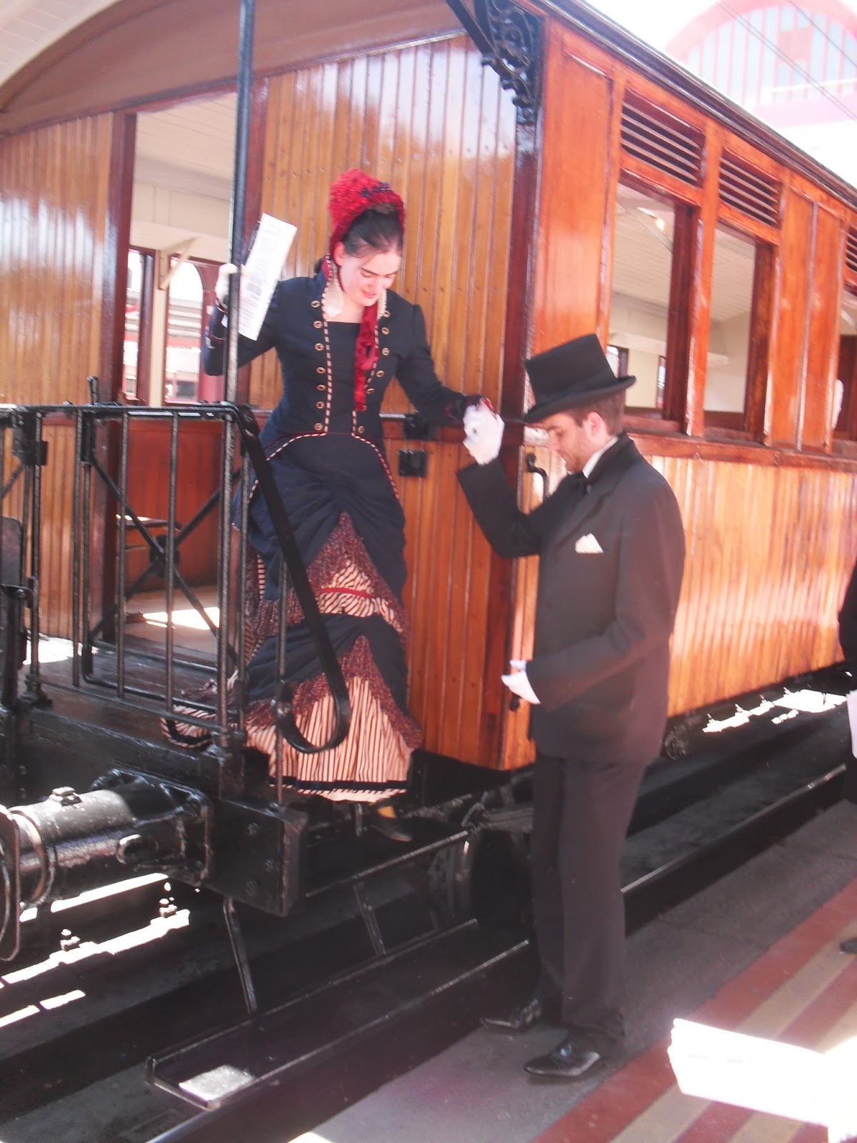 La organización del Centro de Estudios Históricos del Ferrocarril Español (C.E.H.F.E.) nos propuso que asistiéramos a la inauguración del tren que recientemente habían restaurado durante casi diez largos años. Nosotros llevamos nuestros trajes que repasaban la moda desde 1880 hasta 1912. Nereida vino con su espectacular traje de forma natural, su simpática mami Marisol con un traje de final de siglo, Eva con su vestido de 1912, Luis Miguel, como ya he mencionado, con traje negro y sombrero de copa y yo modifiqué un poco la cola de mi vestido de forma natural poniéndole un polisón como la moda hasta 1889.