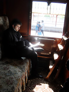 Centro de Estudios Históricos del Ferrocarril Español (C.E.H.F.E.) nos propuso que asistiéramos a la inauguración del tren que recientemente habían restaurado durante casi diez largos años. Nosotros llevamos nuestros trajes que repasaban la moda desde 1880 hasta 1912. Nereida vino con su espectacular traje de forma natural, su simpática mami Marisol con un traje de final de siglo, Eva con su vestido de 1912, Luis Miguel, como ya he mencionado, con traje negro y sombrero de copa y yo modifiqué un poco la cola de mi vestido de forma natural poniéndole un polisón como la moda hasta 1889.