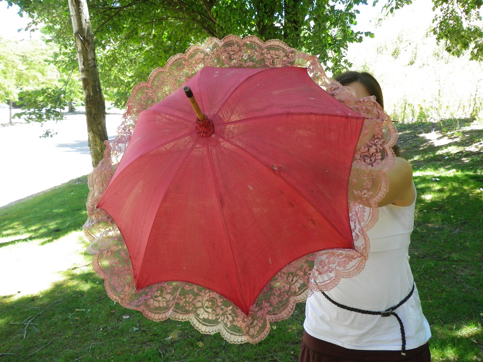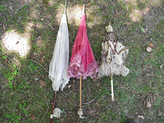 Fue todo un hallazgo y un pequeño tesoro que poseo. Siempre me han apasionado las sombrillas antiguas, pero las de verdad, no los paraguas que hacen ahora queriendo imitar sombrillas, pues soy un poco tiquismiquis con la forma de las varillas y la tela que usan. Y a pesar de la modernas ténicas de elaboración de hoy día, no consiguen hacerlas con la forma de antes, y eso me lleva a desilusionarme cuando intentaba comprar alguna. Ahora ya tengo mi pequeña colección y además son auténticas :)